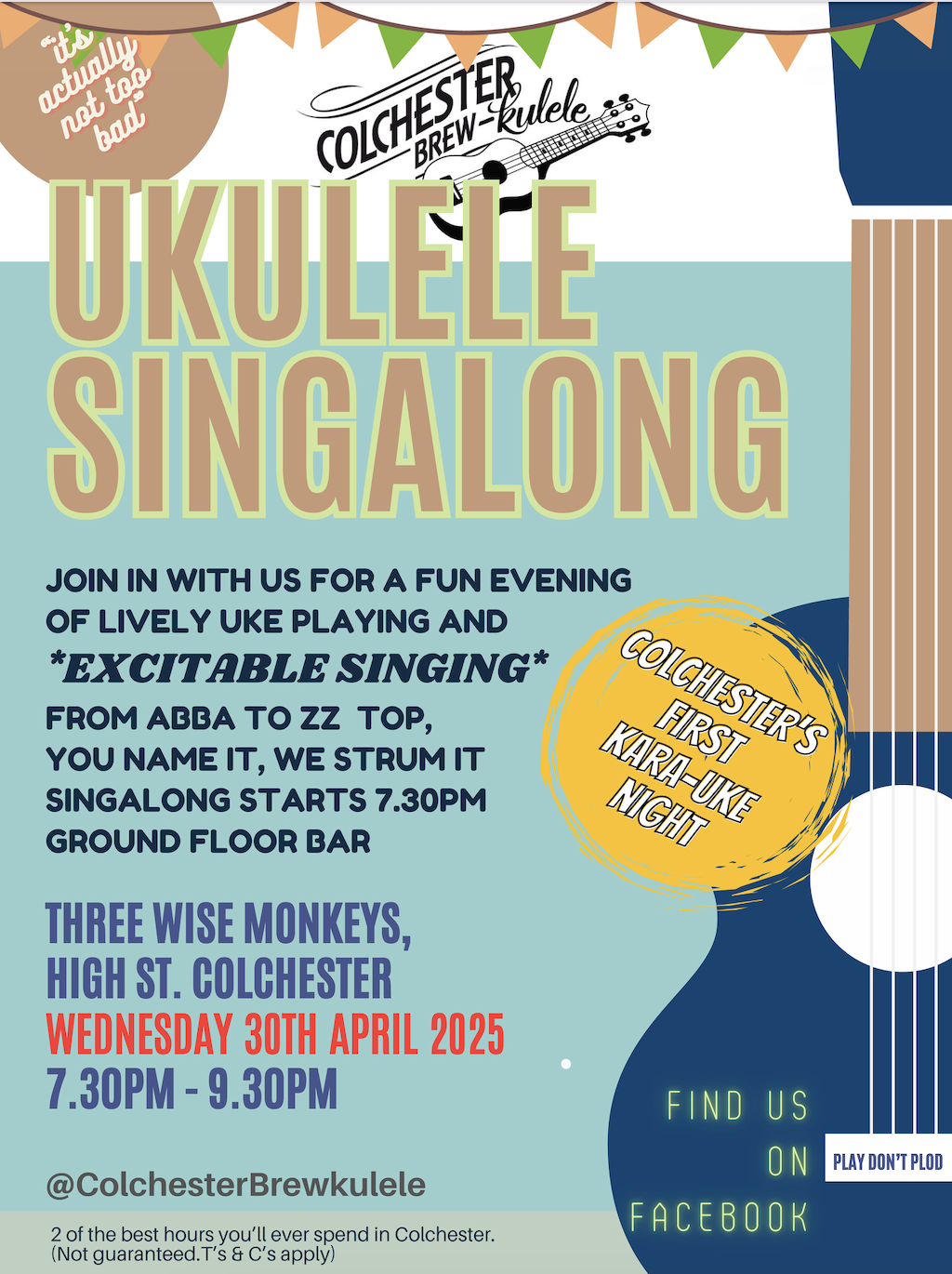 About Colchester Brewkulele: started in 2014 as Colchester Ukulele, and in 2023 the group relaunched as Brewkulele with the support of Colchester Brewery, and in 2024 relocated to Three Wise Monkeys which is the perfect venue for a group which often pulls in close to 40 ukes. https://www.facebook.com/COLCHESTERUKULELE