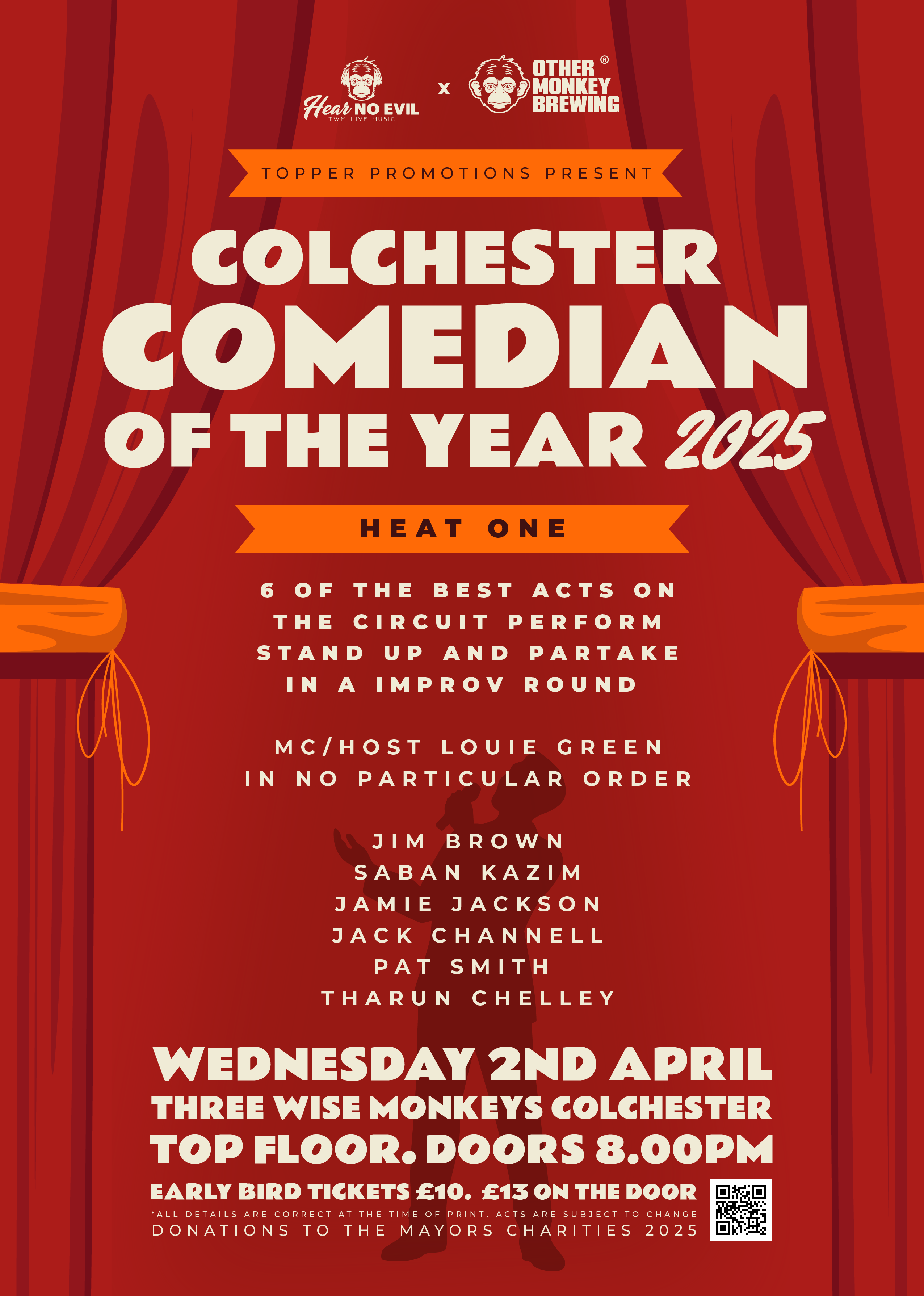 Be part of comedy history! The inaugural Topper Promotions Colchester Comedian of the Year 2025 is here, and YOU have the power! With the audience holding 50% of the vote, your laughter will decide who takes the crown. See a diverse lineup of comedic talent not only perform stand-up routines, but also battle it out in “Mock the Week” and “Whose Line Is It Anyway?” style games. It’s more than just stand-up; it’s a hilarious test of improv and wit! The winner walks away with a cash prize and the incredible opportunity to perform at a special event hosted by the Colchester Mayor. Don’t miss this chance to shape Colchester’s comedy scene – grab your tickets now!