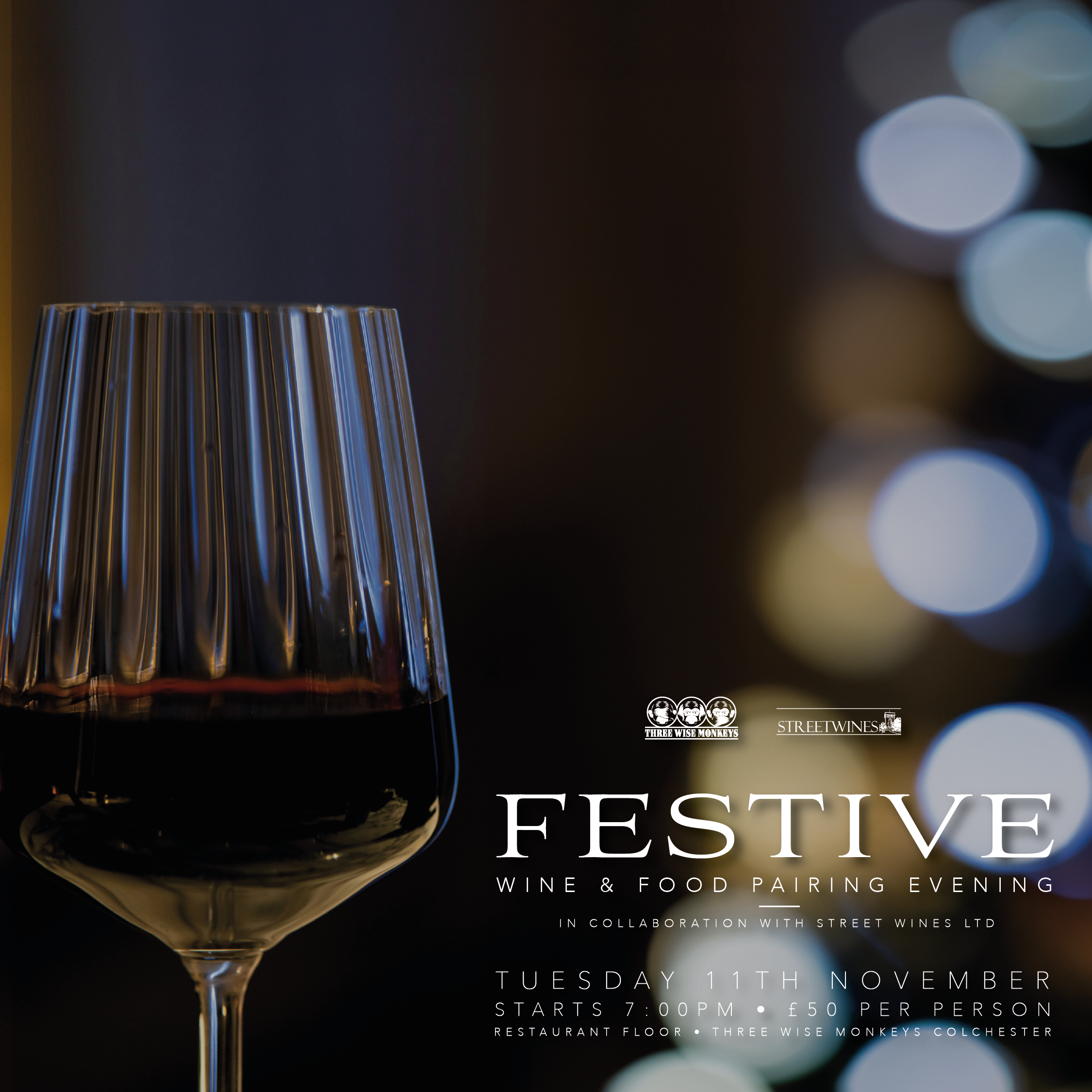 Join us on Tuesday 11th November for our Festive Wine & Food Pairing Evening. Explore wines for Christmas as we take you through four-courses of seasonally inspired food and wine at Three Wise Monkeys – in collaboration with independent and local wine merchants and suppliers, Street Wines.
