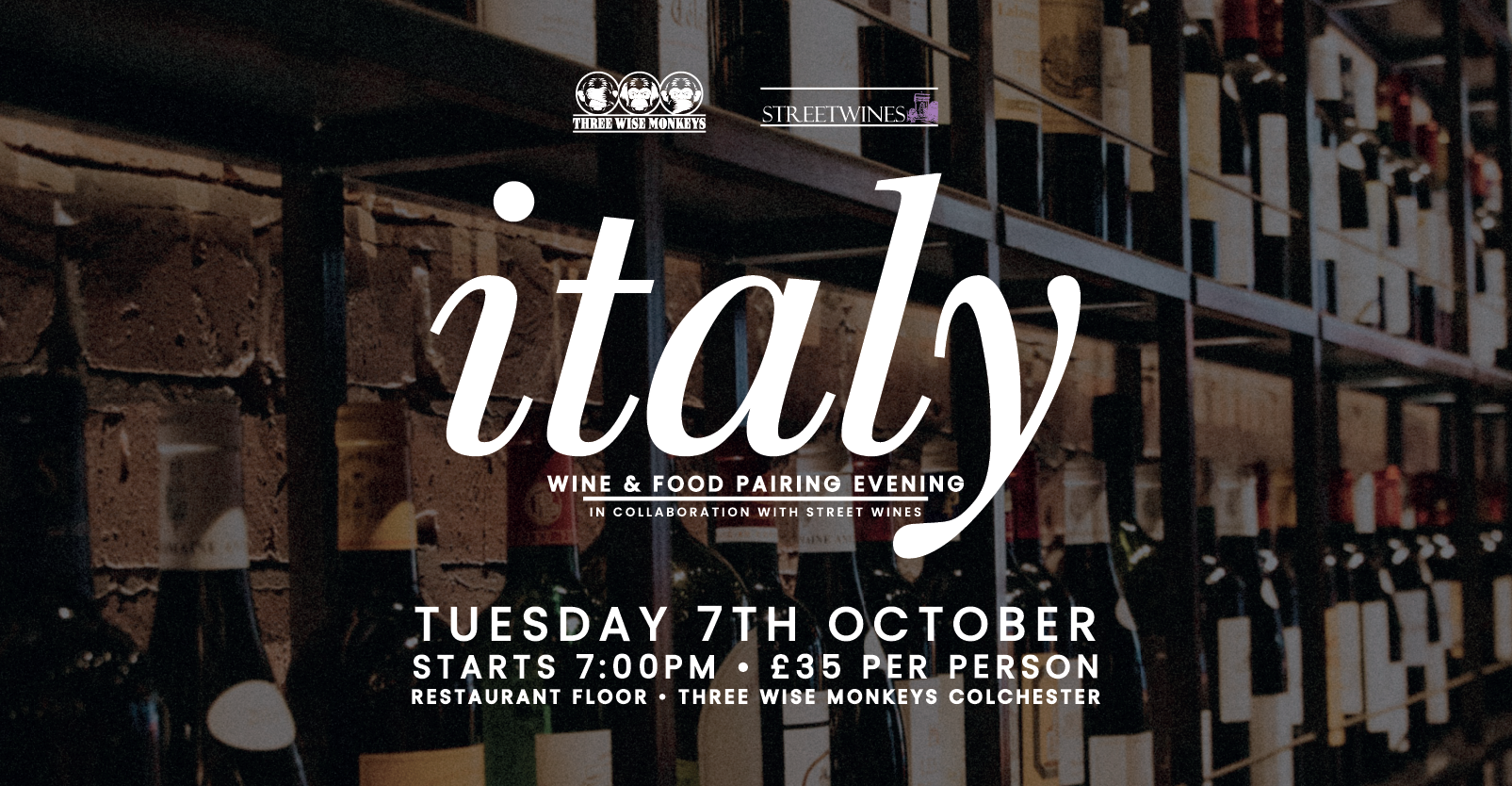 Join us on Tuesday 7th October for our Italy Wine & Food Pairing Evening. Italian wine comes to Roman Colchester as we take you through four-courses of seasonally inspired food and wine at Three Wise Monkeys – in collaboration with independent and local wine merchants and suppliers, Street Wines.