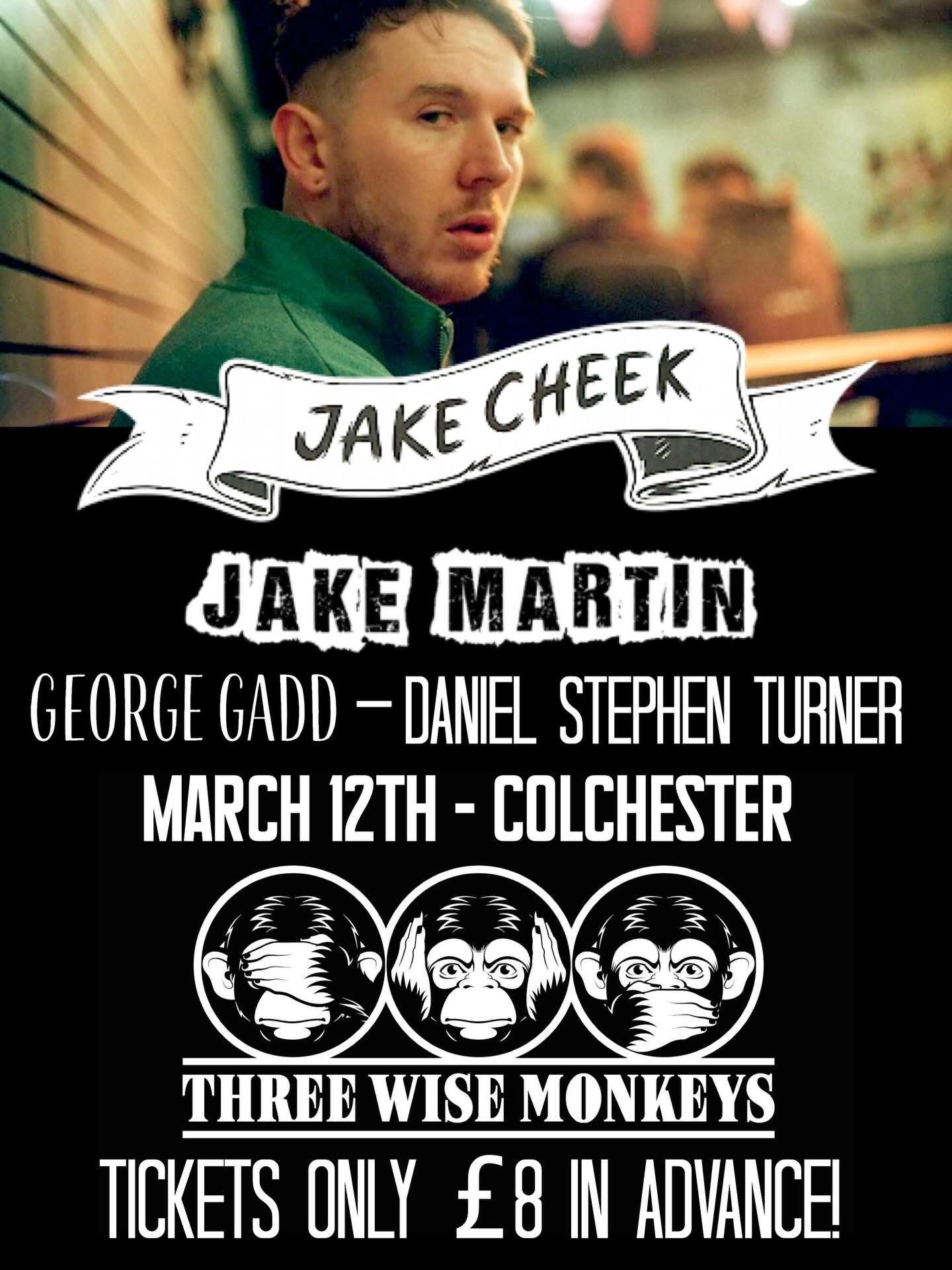 Jake Cheek performs live at Three Wise Monkeys, Colchester, with support from Jake Martin, George Gadd, and Daniel Stephen Turner.