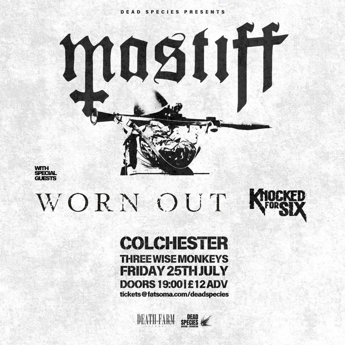 MASTIFF headline three wise monkeys in Colchester on Friday 25th July 2025 bringing a relentless and depressive barrage to Essex with main support from Irish hardcore titans WORN OUT and local support from Essex hard-hitters Knocked For Six.