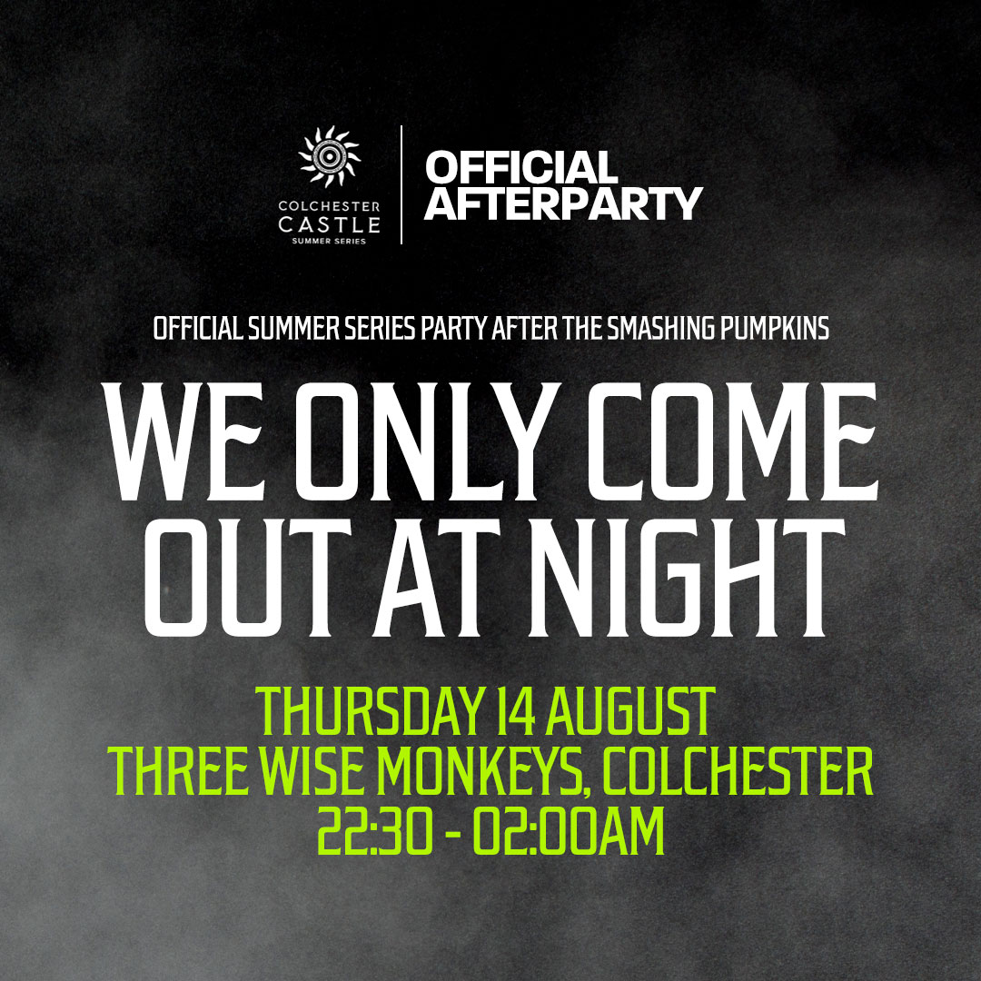 After The Smashing Pumpkins tear up Castle Park on Thursday 14th August, don’t let the night end there! Head to Three Wise Monkeys in Colchester for the Colchester Castle Summer Series – Official After Party, where we’ll be keeping the energy alive until 2AM. Expect guest DJs spinning the best in ’90s alt-rock – think Smashing Pumpkins, Nirvana, Hole, Pearl Jam, and more – as we celebrate a night of legendary music. Whether you’re still buzzing from the gig or just getting started, this is where you need to be. See you there – because We Only Come Out at Night!